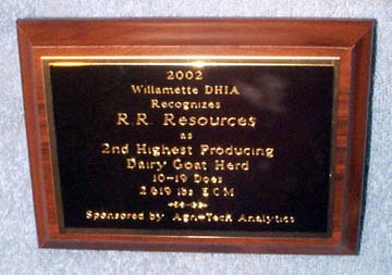 | Here is another "achievement" that the does did while testing for the 1st time. Our herd was the 2nd highest in production for 2002 in herds with 10-19 does through the Willamette DHIA. The girls "done good"! I'm very proud of them. : ) I have a picture of the plaque they won below. |